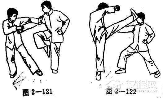 当对手意图以上抬腿来击时,迅速以掀腿配合手部扣压来踢对手的脸部(图2-121, 122)。