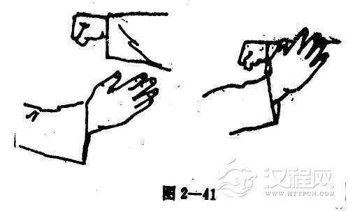 当对手正拳攻湘付,先以左掌由上往下压开,缓和其攻势后,转压手为抓字诀,以五指抓住其右手腕部,此动作为压手变封闭手(图2一43)。