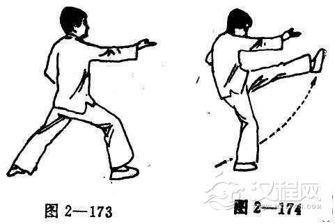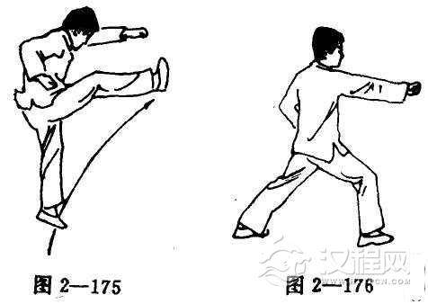(3)右脚往上跃起的同时,以脚尖前踢(图2-175)。