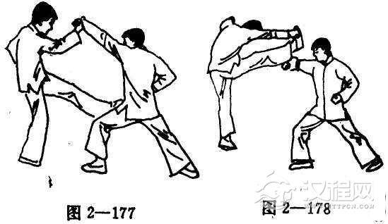 先以左脚尖赐向对手腹部,若其后退闪避,应迅速往上跃起,出右脚尖攻击对手下颚。而本技法的巧妙点就在于着地后雄浑有力的连续正拳攻击(图2-177, 178)。