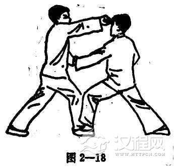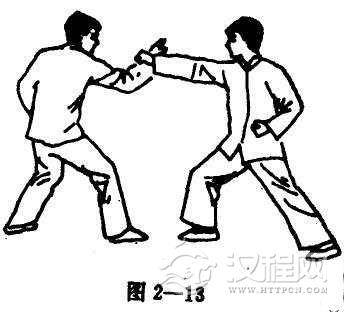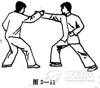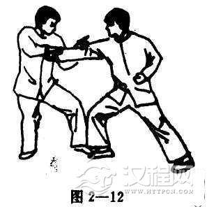 当对手攻出正拳时,首先用右手挡其架势,并以手掌抓住对手之右腕,继而突出左手扣住其肘部之麻穴(图2-11,12)。
