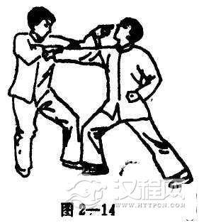 先出右手架住对手出击之右拳,同时反守为抓,再出左手食、中二指突击对手眼部(螳螂拳出左手时,抓住对手右腕的右手应用力往右后带)(图2-13, 14)。