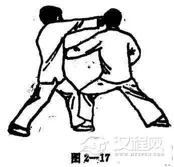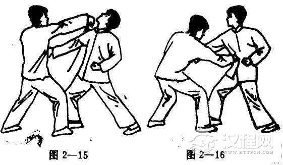 以左手抓住对手右拳往自己下半身部位拉,同时出反拘手敲击其下颚,随即手指握紧成拳,顺势打击对手之胃部(图2-15, 16)。
