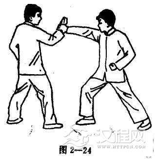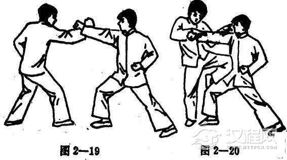借右手格开对手之右拳,再以擒拿或取眼的方法,近身肉搏用膝盖,远攻用脚尖来踢向对手(图2-19, 20)。