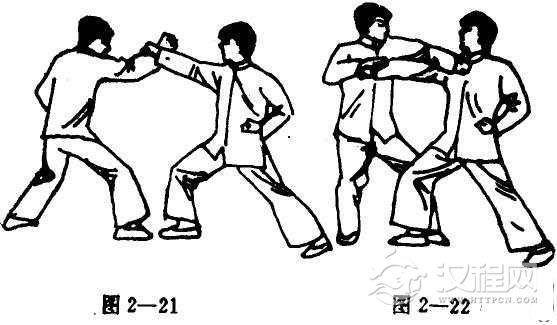 右手先缓冲对手之右拳,旋即抓住其腕部,并出左螳螂手,以指尖刺向对手的喉头(图2-21, 22)