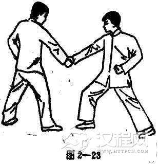 右手腕被对手抓住时,可将自己的右手旋转一圈,先脱开后立刻扣住其手脖颈处,顺势拧转(图2-23, 24, 25)