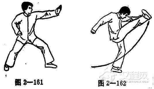 (2)右脚前抬,踢及左掌心(图2-162)。