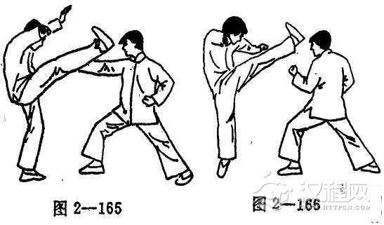 先出括面脚攻击对手,若对手有所警觉而躲闪时,应立刻改为摆脚侧踢对手面部(图2-165, 166)。