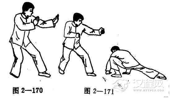(4)双脚着地后成左脚在前的虚势或不丁不八势,其次依前项顺序左右脚交换练习(图2-170)。