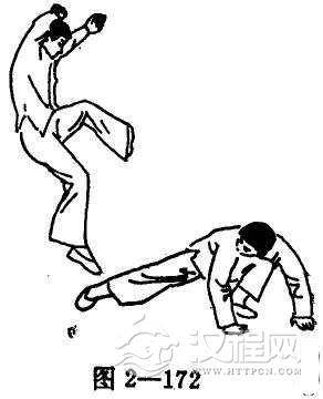 逢对手以前扫腿来击时,最上上策就是一面上跃避开攻势,一面出单脚由上往下踢采其头部(图2-171, 172)