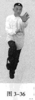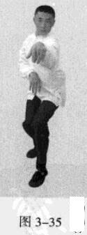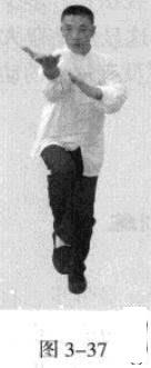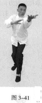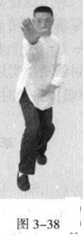 起势熊出洞。移动重心向前,以头领身,身带步,右脚过左脚向前踩出一步,脚尖落地,内扣15度,后脚随追半步,成立身中正之势,以保持重心的稳固;同时,右手掌心朝上由左臂下向前螺旋拧裹穿出,变为掌心朝前,以掌根发力,左手伏按于右肘部。(图3一35一图3一38)