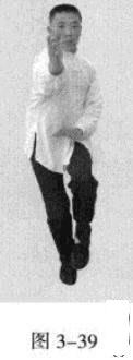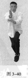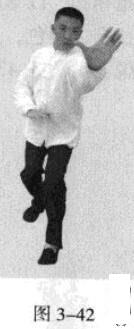 承上式。移动重心向前,以头领身,身带步,左脚过右脚向前踩出一步,脚尖落地,内扣15度,后脚随追半步,成立身中正之势,以保持重心的稳固;同时,左手掌心朝上,由右臂下向前螺旋拧裹穿出,变为掌心朝前,以掌根发力,右手伏按于左肘部。(图3一39一图3一42)