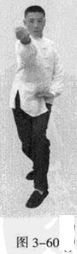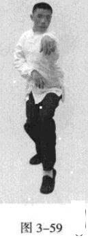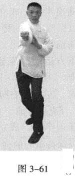 起势熊出洞。移动重心向前,头领身,身带步,左脚向前踩出一步,脚尖着地,内扣15度,右脚随追半步,以保持重心的稳固;同时,右拳向前钻裹而出,又变为向左侧下方运动,落至腹前。此为里括(图3一59一图3一61)。