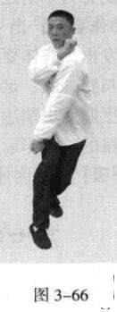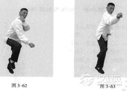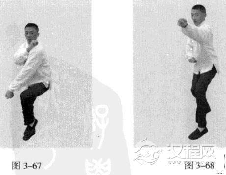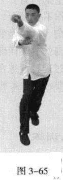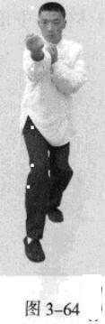 承上式。移动重心向前,头领身,身带步,右脚向前踩出一步,脚尖着地,内扣15度,左脚随追半步,成立身中正之势,以保持重心的稳固;同时,左拳向前钻裹而出,又变为向右侧下方运动,落至腹前。此为里括(图3一64、图3一66)。