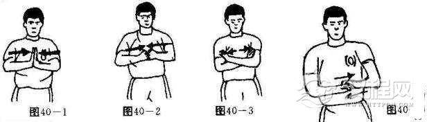 练习方法:双脚开立同肩宽.令全身放松,然后试着控制全身各部位肌肉有节奏的紧张~放松~紧张~放松,如此连续做10秒.注意体会松紧时之肌肉感觉。不停,双手竖掌,掌心相抵.肘臂运动静止用力互顶.练习20秒(图40-1)。然后甩甩手放松一下,再以双手握拳于脚前以双拳面静止用力互顶,练习20秒(图40-2),稍放松一下,如图40-3双手胸前互抱,两手同时发力向外互相撑顶,练习20秒。然后双手指相扣于胸前,同时反向静止用力外拉对抗.练习20秒(图40-4)