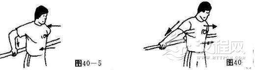 稍放松,再以双手背后按抓栏杆或其它物体,以肩背腹肌同时静止用力先向内收。然后再同时静止用力向外扩,一收一扩练习30秒(图40-5、6)。