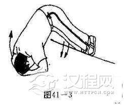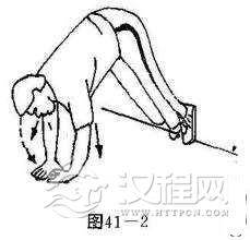 双臂肘关节向左右侧弯曲(双腿不可弯曲)慢慢地使身体落下,直至你的前额接触到手为止(图41一3)。