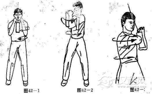 以纸为目标,两手屈肘松握拳至胸前,两脚平行站立于距纸约17-25cm处。双膝微曲(图42-1)然后向右顺时针转动身体直到脚趾欲随势转动时止,此时你身体应完全转向右侧,与目标成90度角,身体重心则移至左脚,双眼始终盯住目标(图42-2),不停,以脚趾为轴,突然向左侧转髋,身体重心则迅速移至另一脚,同时抬右肘与肩同高,利用以髋带肩转动之力击向目标.这个转腰之力,应恰好使你身体转动180度,面向左侧,即与开始相反之方向(图42-3).