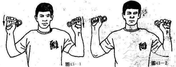 练习方法:将表或闹钟放在你看见的地方,如(图43-1)两脚开立,双手体侧屈肘向上分别握住握力器把柄。