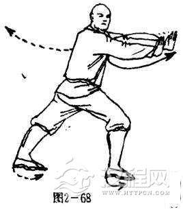 两腿弓步不变,两掌旋腕环弧向前推击,两掌心斜向前,掌指斜向上.目视右前方(图2-68).