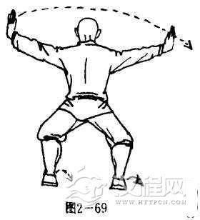 两脚为轴,体左转90度,两腿屈膝成马步.同时,两臂屈肘两掌收回胸前,然后向两侧直臂猛推,两掌尖高与耳平,掌心向外,掌指向上.目视前方(图2-69)。