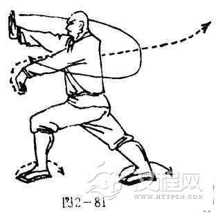 两脚踞地,体右转180度,右腿屈膝,左腿蹬直成右弓步,同时,左勾手变掌,两掌转体之势猛力向前后推开,左掌在前,右掌在后,两掌心斜向外,掌指斜向上.目视前方(图2-82).