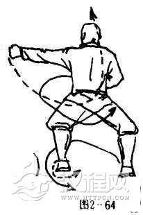 右脚为轴,体右转90度,左脚在左侧一步展脚落地,两腿屈膝成马步,同时,左拳随势由后向左扳击,拳高与肩平,拳心向前,拳眼向上,右臂屈肘右拳护于胸前右侧,拳心向内,拳眼向上。目视左拳(图2-64).