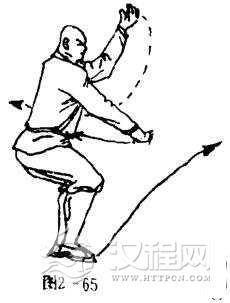 右脚离地,左脚碾地,体左转270度,右脚向左脚内侧并步,震脚落地,两腿屈膝半蹲,同时右掌随势向前下方直臂揣击,掌心向下,掌指斜向左;左掌上架头前上方,掌心斜向右,掌指斜向上.目视右掌(图2一65).