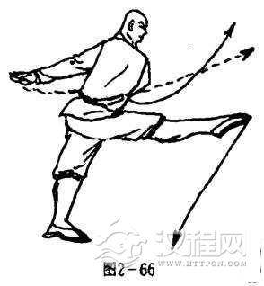 左腿直立支撑,抬右腿向前方弹踢,同时两掌猛力下封甩于左后侧方,两掌心斜向上,掌指斜向后。目视前方(图2一66).