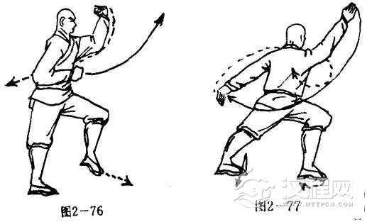 重心前移,落于右腿,左腿屈膝提起,右腿直立支撑,成独立步,同时,左臂屈肘左拳上挑于头上左前方,拳心向内.拳眼向外,右臂屈肘右拳护于右肋前侧,拳心向内,拳眼向上.目视前方(图2-76).