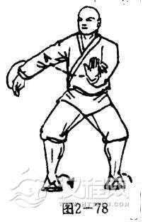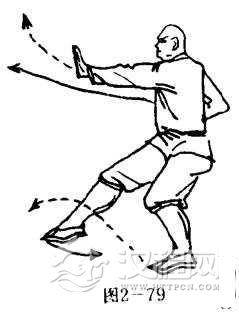 两脚服地,体右转90度,两腿屈膝,右脚尖点地,左腿支撑成右虚步,同时,左掌向前直臂推出,成正立掌,一掌心向前,掌指向上,右锗屈肘右拳收护于右肋外侧,掌心斜向前,掌指斜向上.口视前方(图2-79 ).
