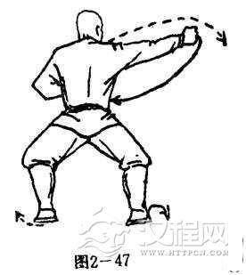 左脚为轴碾地,体左转90度,右脚在右侧震脚落地,两腿屈膝成马步,同时,两掌变拳,右拳由体前向右侧崩击,拳高与肩平,拳心向前,拳眼向上,左臂屈肘左拳护于左肋前,拳心向上,拳眼向外.目视右拳(图2-47)。
