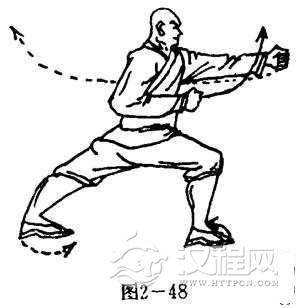 两脚碾地,体右转90度,右腿屈膝,左腿蹬直,两腿成右弓步,同时,左拳随势向前扳击,拳高与肩平,拳心向右,拳眼向上;右竹屈肘右拳护于胸前右侧,拳心向左,拳眼向上.目视前方(图2一48)。