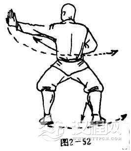 两脚跳起,左脚震脚下落,以左脚为轴,体右转180度,右脚迅速落于左脚内侧一步,两腿屈膝成马步,同时,左掌迅速推向左侧,掌心斜向左,掌指向上,右臂屈肘右掌收护于胸前右侧,掌心斜向前,掌指向上.目视左侧方(图2一52).