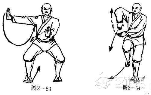 上动不停,右腿屈膝提起,左腿支律,成独立势,右臂屈肘收回在右侧向上提掌,掌心向后,掌折向下,左掌抹擦右掌背,然后护于腰问右侧,掌心斜向后,掌指向右。目视右侧前方(图2- 54).