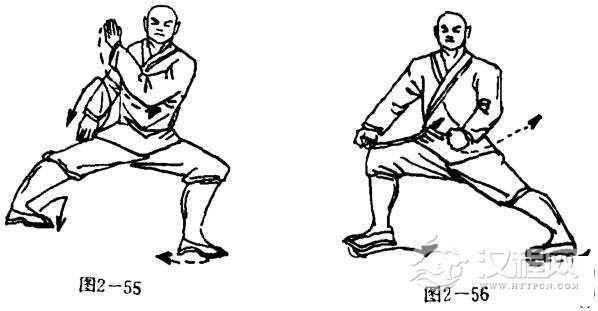 左脚尖外旋,右脚在右侧落下,右脚尖向左,左腿屈膝,右腿蹬直,两腿成左横弓步.同时,右掌由上向下按压于体右下侧,掌心斜向下,掌指斜向前,左臂屈肘左掌沿右掌背上滑,然后护于右肩前上侧,掌心向后,掌指斜向上.目视前方(图2-55).