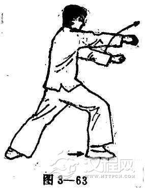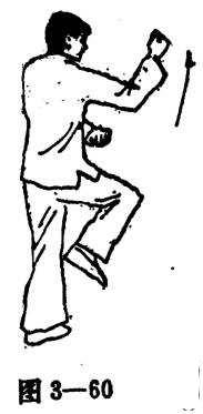 与前招势同样采用独立势。右拳腕弯屁:从上挑击出(图3-60)