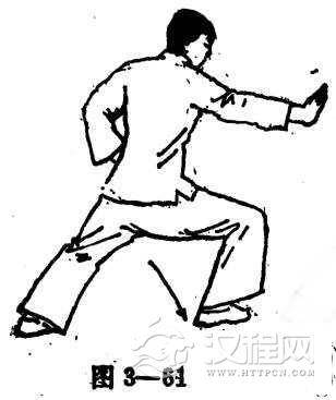 右脚往前踏出,成登山势、右掌前击,掌心向前。左掌回收置于左腰际(图3-61)