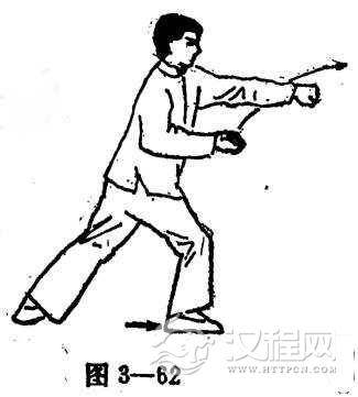 右脚由前式位置用力前踏,同时左拳击出,右掌变拳置于左拳之下侧。此时,左拳拳背朝上、右拳拳背朝下(图3一62)。