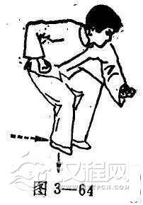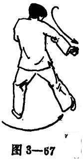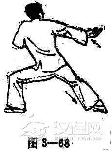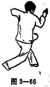 (2)右手成螳螂手,再由前往后侧扣击,同时右脚依揪腿的要领前划,保持脚底不着地的姿势(图3-67).
