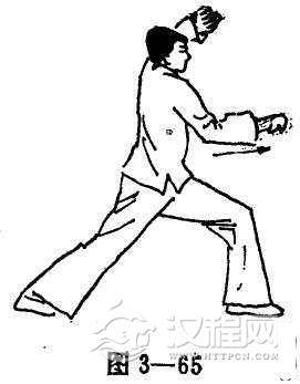 (2)左脚急速往前跨出,成登山势,左腕上提置于头上,拳心向左,同时将右拳自肚脐同高位置向前击出(图3-65 )