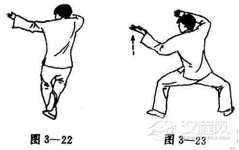 往左后方击出的双手可以为掌。也可以为拳之攻势。