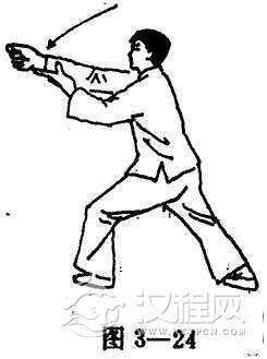 左脚如同前踏的感觉状态下,身体成登山势,并用左掌心托住往前击出的右拳(小指侧)(图3-24)