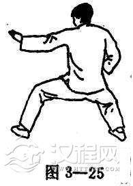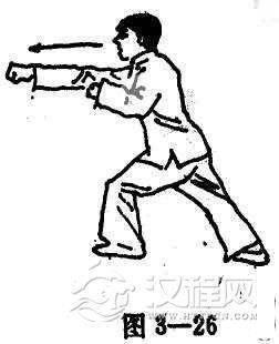 身体重心后移至右脚,成四六势,再将右拳回收于腰际,扭腰后前脚承受体重成登山势,同时击出右拳,且保持左掌位在右肋下方的姿势(图3-25 3-26)