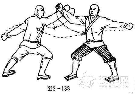 甲右弓步不变,两掌变拳,右拳上架乙方右拳,拳心向左,拳眼斜向后,左拳展于体后左侧,拳心向左,拳限向上.目视乙方(图2一133)。