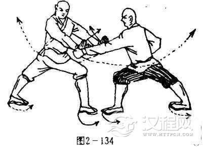 乙弓步不变,上体右转,两拳变掌,向甲左臂猛力推击,两掌心斜向前,掌指向上.目视甲臂(图2-134).
