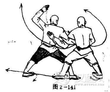 甲两脚踞地,体向右转90度,两腿成右弓步,上体向前侧靠挤.目视乙方(图2-141 )