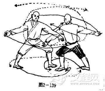 乙用左掌向里拨甲左掌,甲两脚向后移步,同时,左掌反手再抓向乙方档部,’拿心向右,掌指斜向前,右掌展于体后右侧,掌心斜向右,掌指斜向后.乙左掌再向外开,掌心斜向下,掌指斜向前,右掌反腕展于体后右侧,掌心余卜向上,掌指料向后.甲乙双方互相对视(图2-139) ,