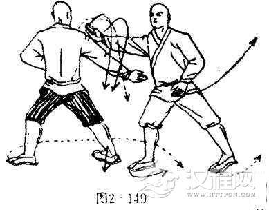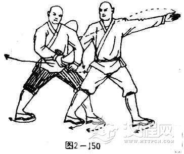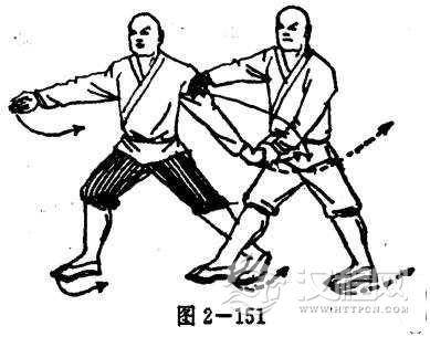 乙两脚为轴,休左转90度,两腿成左弓步;右掌被拿,左掌外展于左侧方,掌心向前,.掌指向左.目视右前侧(图2-150).
