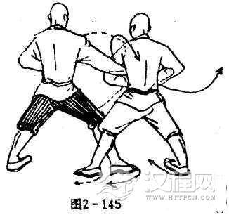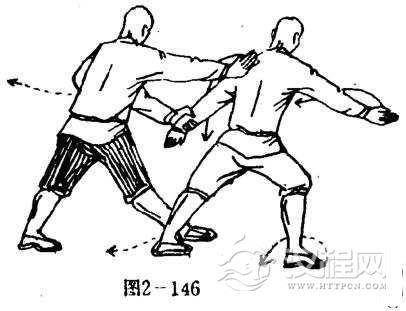 甲右掌被拿,体向右靠,成右弓步,同时,左臂屈肘、左掌护于腰间左前侧,掌心向右,掌指向上.目视乙方。(图2-145).